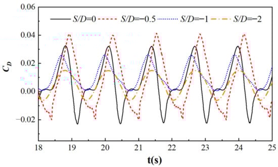 Figure 7 shows the resistance coefficient curves of a cylinder at different submergence depths, with R = 0.05 m, T = 1.29 s, and Ur = 2.408. From the graph, it can be seen that as the submergence depth increases, the resistance coefficient first increases and then decreases. When S/D = 0, although the cylinder is in a semi-submerged state, the calculated resistance coefficient is relatively high under the action of waves. When S/D = −0.5, the cylinder is tangent to the free surface and is subjected to the combined action of waves and currents. At this time, both the horizontal force on the cylinder and the resistance coefficient are the highest. When S/D = −1 or −2, the cylinder is far from the free surface, which weakens the influence of waves on the cylinder, significantly reducing the drag coefficient.