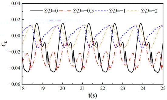 Figure 8 shows the lift coefficient curves of a cylinder at different submergence depths, with R = 0.05 m, T = 1.29 s, and Ur = 2.408. From the graph, it can be seen that when S/D = 0 or −0.5, the lift coefficient is mostly negative, meaning that the cylinder is subjected to an upward force. This is because only a portion of the flow above the cylinder passes through, and an upward force is generated under the impact of the flow below. When S/D = −1 or −2, the cylinder is a certain distance from the free surface, and the lift coefficient fluctuates around 0, weakening the influence of the free surface and waves.