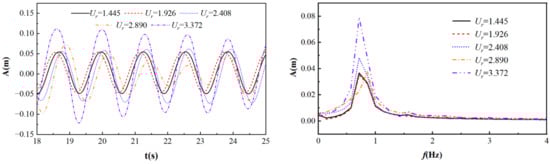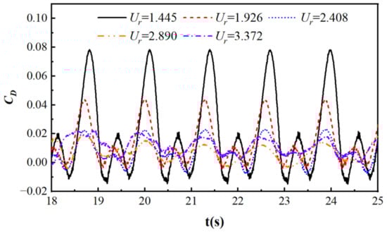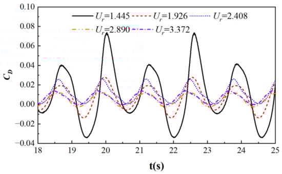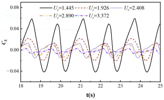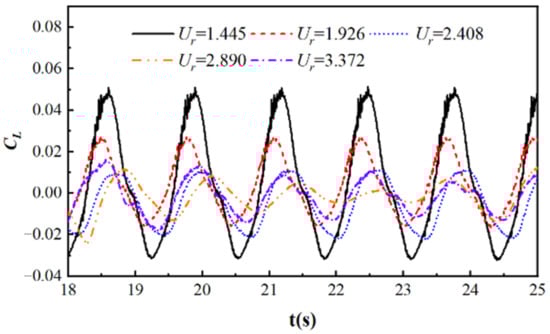 Figure 10 shows the lift coefficient curves of a cylinder at different flow velocities, with R = 0.05 m, T = 1.29 s, and S/D = −2. From the graph, it can be seen that as the flow velocity increases, the lift coefficient gradually decreases and fluctuates around 0. When Ur = 1.445, the lift coefficient is large, and the cylinder is affected by the combined effects of waves and currents. Only the flow velocity is dimensionless, resulting in a larger calculation result. When Ur = 1.926~3.372, the period of the lift coefficient curve is significantly reduced compared to the case when Ur = 1.445, mainly due to the dimensionless formula.