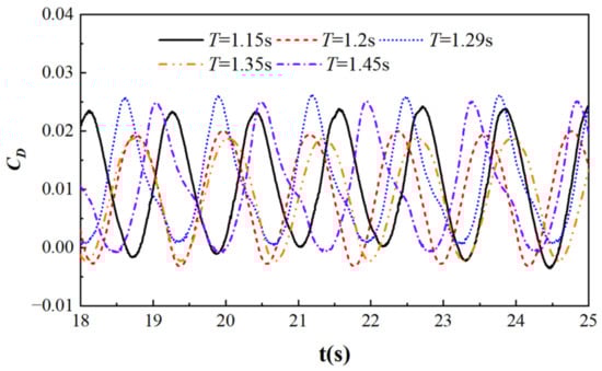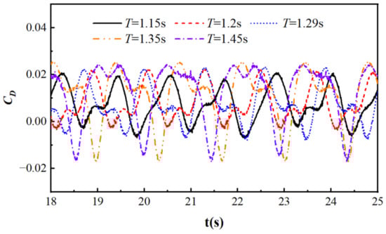 Figure 11 shows the resistance coefficient curves of a cylinder under different wave periods, with R = 0.05 m, Ur = 2.408, and S/D = −2. From the graph, it can be seen that as the wave period increases, the drag coefficient does not change much. When T = 1.15 s, due to wave reflection and wave blocking, the resistance curve is not smooth, and the wave blocking effect begins to increase after 23 s. When T = 1.29 s or 1.45 s, the drag coefficient is also affected by wave reflection, but the effect is weaker compared to the case when T = 1.15 s; additionally, wave blockage does not increase significantly with time. When T = 1.2 s or 1.35 s, the overall coefficient is lower compared to that in other situations.
