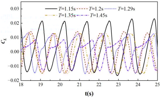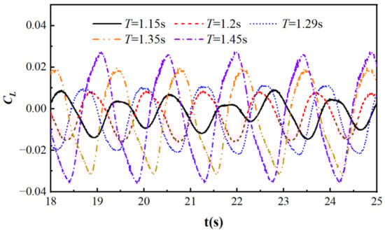 Lift coefficient diagram under different wave periods.