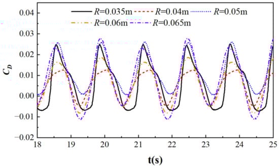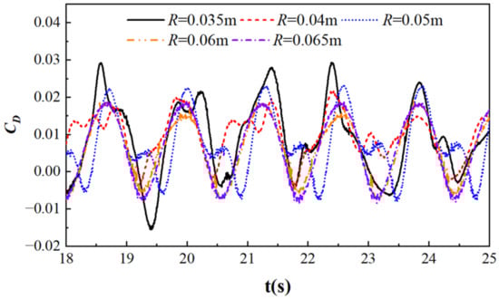 Figure 13 shows the resistance coefficient curves of cylinders with different cylinder sizes, with T = 1.29 s, Ur = 2.408, and S/D = −2. From the graph, it can be seen that as the radius of the cylinder increases, the drag coefficient first decreases and then increases. When R is small, the absolute distance between the cylinder and the free surface is also small, and under the action of waves, wave reflection and blockage effects are obvious. When R = 0.05 m, the absolute distance between the cylinder and the free surface is relatively great, which weakens the wave reflection and blocking effects. When R is large, although the absolute distance between the cylinder and the free surface is also relatively large, the increase in cylinder volume intensifies the fluctuation of the free surface under the impact of flow velocity.