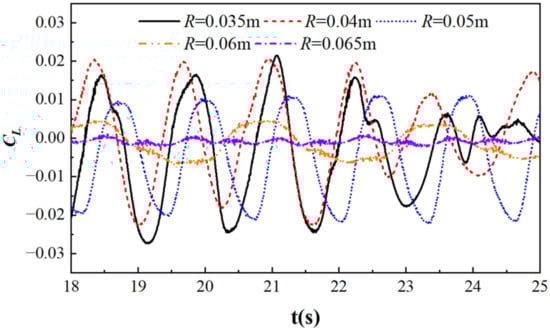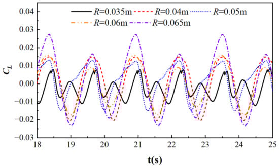 Lift coefficient curves of cylinders with different cylindrical radii.