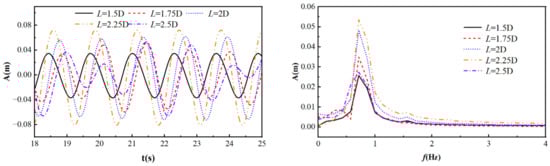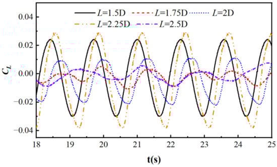 Figure 30 shows the lift coefficient curves of a rigid rotating cylinder under different arm lengths, with S/D = −2, R = 0.05 m, T = 1.29 s, k = 2 N/m, and Ur = 2.408. From the graph, it can be seen that as the length of the lever arm increases, the negative lift coefficient gradually increases and the positive lift coefficient gradually decreases. When L = 1.5D, the rotation angle of the cylinder is larger, the rotation speed of the cylinder is greater, and its lift coefficient is not periodic, making it more complex. When L = 2.5D, the length of the lever arm increases, the rotation angle decreases, and the lift coefficient becomes regular and predictable.