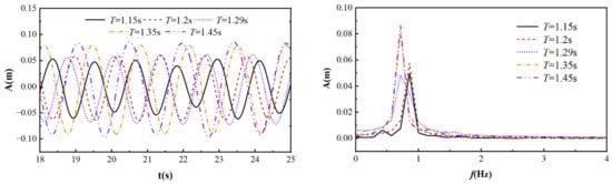 Figure 24 shows the lift coefficient curves of a rigid rotating cylinder under different wave periods, with S/D = −2, R = 0.05 m, Ur = 2.408, k = 2 N/m, and L = 2D. From the graph, it can be seen that as the wave period increases, its lift coefficient gradually increases and the periodicity of its lift curve becomes more pronounced. When T = 1.15 s, the period is small, and during the rotational motion of the cylinder, it has a significant impact on the propagation of waves, resulting in unstable changes in the resistance coefficient. When T = 1.45 s, the period is relatively large, and the wave propagation process is relatively smooth. The impact of the cylinder’s rotational motion on the waves is relatively small, ultimately leading to an increase in the stability of the cylinder’s force.