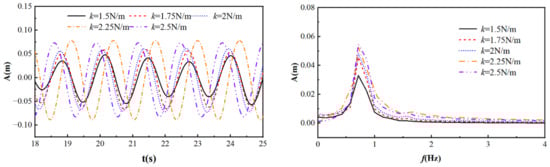 Zhou et al. [19] established a numerical model of wave flow based on the CFD method and verified its accuracy with experimental data. By studying the hydrodynamic characteristics of a horizontal cylinder under different spring stiffness conditions, the results showed that with the increase in k value, the vibration amplitude of the cylinder first increased and then decreased. When the vibration amplitude reached its peak, the vibration frequency was consistent with the wave frequency, resulting in resonance.