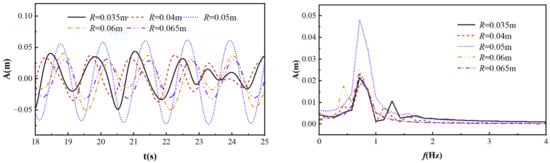 Figure 28 shows the lift coefficient curves of a moving cylinder at different cylinder radii, with S/D = −2, k = 2 N/m, T = 1.29 s, Ur = 2.408, and L = 2D. From the graph, it can be seen that as the radius of the cylinder increases, the overall trend gradually decreases. When R = 0.035 m, the radius of the cylinder is smaller, the absolute distance from the free surface is shorter, and it is strongly affected by wave currents, so its lift curve is more complex. When R = 0.05 m, compared to R = 0.035 m, the curve is relatively stable, and as the radius continues to increase, the lift coefficient becomes unstable again.