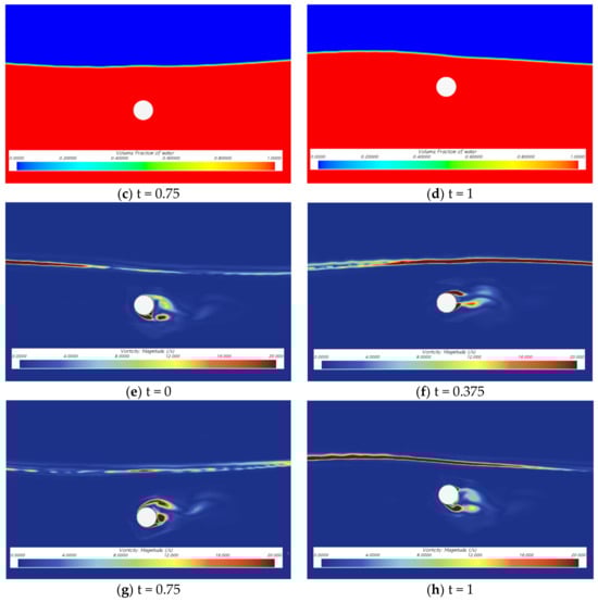 Reichl [1,2] conducted a numerical simulation study on the vortex field around a cylinder, utilizing different submergence depths near the free surface under the action of flow. The results showed that the vortex field around the cylinder changed significantly with the change in submergence depth, and the smaller the submergence depth, the more asymmetric the vortex field. In addition, the influence of changes in the Froude number on the free surface and vortex field was also studied. Wu and Young [3] conducted numerical simulation research on the oscillatory motion of a horizontal cylinder in a stationary fluid; they presented the changes in the vortex field during cylinder motion, comparing and verifying the simulated force results with previously obtained results. This study focuses on the validation of numerical methods; the analysis of the fluid field characteristics around the cylinder is not extensively discussed, and the strong nonlinear phenomena in the selected operating conditions are not obvious. In the study of horizontal cylinders under differing wave current conditions, Bozkaya [4] used a self-developed finite volume method program to numerically simulate the vortex field around a vibrating cylinder in the flow. The study mainly focused on the influence of two variables—the cylinder’s vibration frequency and submergence depth—on the vortex field around the cylinder.