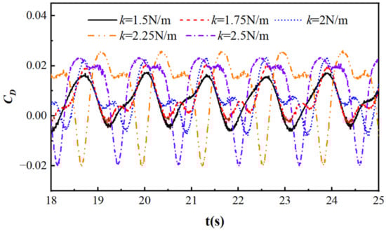 Figure 25 shows the resistance coefficient curves of a rigid rotating cylinder at different k values at the rotation point, with S/D = −2, R = 0.05 m, T = 1.29 s, Ur = 2.408, and L = 2D. From the graph, it can be seen that as the torque increases, the resistance coefficient gradually increases. The greater the torque, the stronger the reverse force generated, which offsets some of the forces on the cylinder and weakens the influence of the waves. When k = 2 N/m, the torque is small, which limits the displacement of the cylinder, and the minimum distance from the free liquid surface increases, weakening the horizontal force of the waves. When k = 2.5 N/m, the torque is greater, which further limits the displacement of the cylinder. The minimum distance from the free surface increases, and it is less affected by waves, leading to an increase in the resistance curve.