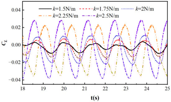 Figure 26 shows the lift coefficient curves of a rigid rotating cylinder at different k values at the rotation point, with S/D = −2, R = 0.05 m, T = 1.29 s, Ur = 2.408, and L = 2D. From the graph, it can be seen that as the value of k increases, the lift coefficient gradually increases. When k = 1.5 N/m, the value of k is small, the amplitude of cylindrical motion is large, and the change in the lift coefficient is unstable. When k = 2/m, as the value of k increases, its lift coefficient becomes relatively stable, and the impact of reflection caused by cylinder blockage on wave characteristics weakens. As the value of k continues to increase, its lift curve becomes smoother.