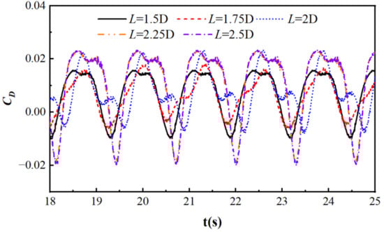 Figure 29 shows the resistance coefficient curves of a rigid rotating cylinder under different arm lengths, with S/D = −2, R = 0.05 m, T = 1.29 s, k = 2 N/m, and Ur = 2.408. From the graph, it can be seen that as the length of the lever arm increases, the resistance coefficient of the cylinder gradually increases. When L = 1.5D, the rotation angle of the cylinder is relatively large. Driven by the rotation of the cylinder, the wave blocking effect increases, weakening the influence of the horizontal force from the wave flow. When L = 2.5D, the length of the force arm increases, the rotation angle and wave blocking effect decrease, and the drag coefficient increases.