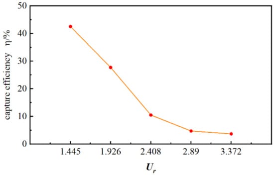 Figure 32 shows the bar graph of the energy capture efficiency of a moving cylinder at different flow velocities, with S/D = −2, R = 0.05 m, k = 2 N/m, T = 1.29 s, and L = 2D. From the graph, it can be seen that as the flow velocity increases, the energy capture efficiency of the rotating cylinder gradually decreases. Under the joint action of waves and currents, the displacement of the cylinder caused by the flow velocity is not significant, resulting in a low energy capture efficiency in the calculation results. When Ur = 1.445, the flow velocity is small, and the influence of waves on the displacement of the cylinder is relatively high. When the flow velocity is non-dimensionalized, its numerical value is higher. When Ur = 2.408, as the flow velocity increases, the amplitude of cylindrical motion does not increase significantly, and the energy efficiency captured in the region decreases. When Ur = 3.372, as the flow velocity continues to increase, although the motion amplitude continues to increase, the total energy per unit time increases due to the increase in flow velocity, ultimately leading to a slight decrease in energy harvesting efficiency.