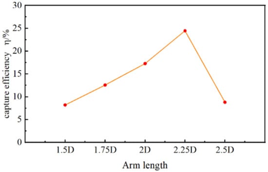 Figure 34 shows the bar graph of the energy capture efficiency of a moving cylinder under different arm lengths, with S/D = −2, R = 0.05 m, k = 2 N/m, and Ur = 2.408. From the graph, it can be seen that as the length of the force arm increases, the energy harvesting efficiency first increases and then decreases. When L = 1.5D, the force arm is shorter, the angle of cylindrical axis motion is larger, and the amplitude of the motion curve is lower, resulting in a lower energy harvesting efficiency. When L = 2.25D, as the length of the lever arm increases, the amplitude of the cylindrical motion slightly increases, and the periodicity of the motion becomes apparent, with the highest proportion of energy being captured in this region. When L = 2.5D, as the length of the force arm continues to increase, the motion period becomes unstable, and the motion amplitude begins to decrease, ultimately leading to a decrease in energy harvesting efficiency.