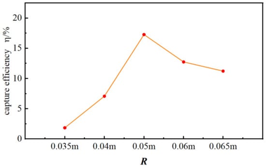 Figure 35 shows the bar graph of the energy capture efficiency of a moving cylinder at different cylinder radii, with S/D = −2, T = 1.29 s, k = 2 N/m, Ur = 2.408, and L = 2D. From the graph, it can be seen that as the radius of the cylinder increases, the energy capture efficiency first increases and then decreases. When R = 0.035 m, the radius of the cylinder is small, and the displacement to radius ratio is large, resulting in a higher energy capture efficiency per unit of time. When R = 0.05 m, as the radius of the cylinder increases, the ratio of displacement to the radius decreases, and the energy captured in the region increases; its total energy also increases accordingly, leading to a decrease in final efficiency. When R = 0.065 m, the radius and the motion amplitude continue to increase, the absolute length of the force arm increases, the rotation angle decreases, and its energy harvesting efficiency is similar to that of the vertical equation.