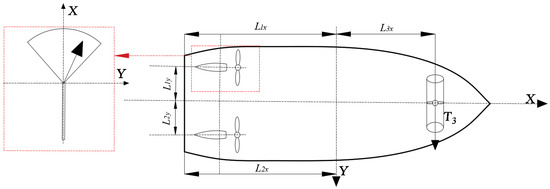 where is the desired control force generated by thrusters; the magnitude of the thrust is represented by the thrust vector , which is a function of the thruster input , where , , and are the propeller speed, rudder angle, and azimuth angle vectors, respectively. is the configuration matrix of the thruster, which is defined as [22]