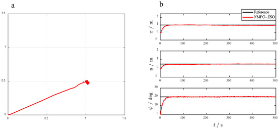 where is the prediction horizon; is the control horizon; is the observed value of ; and , are both positive definite weighted matrices. represents the control constraint set of the system. To simplify the study, the ship’s oscillatory motions caused by wave-frequency disturbances are not considered in this simulation, and the low-frequency environmental loads acting on the ship are simulated with the first-order Markov process [36]: , where is the diagonal matrix of time constants, is a zero-mean Gaussian white noise vector, and is the amplitude matrix of . The simulation conditions are set as follows: the initial position of DP ship ; the desired position of the ship ; and in order to achieve smooth control, the reference signal is set as . The simulation time is set to 500 s.