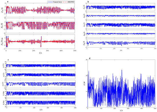 Figure 8 shows the thrust allocation results of the IMOPSO algorithm under closed-loop control. Figure 8a shows that the IMOPSO algorithm is able to track the generalized control force determined by the NMPC controller. Figure 8b shows the decomposition force generated by individual thruster. Figure 8c shows the change in rotational speed and rudder angle of each thruster. Figure 8d shows the variation in the total power consumption of the thruster. These results further demonstrate that the IMOPSO thrust algorithm performs well in accordance with the motion controller, which verifies the effectiveness of IMOPSO algorithm when dealing with the DP thrust allocation problem.