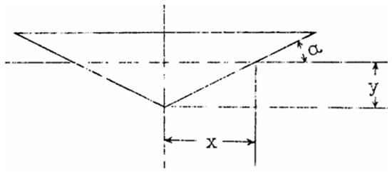 where V0 is the instantaneous velocity in front of the wedge entering water and V is the velocity of the system of motion (wedge and added mass) after the wedge enters the water. The cross section of the wedge when it enters water is shown in Figure 4. The geometric shape of the wedge is as follows: