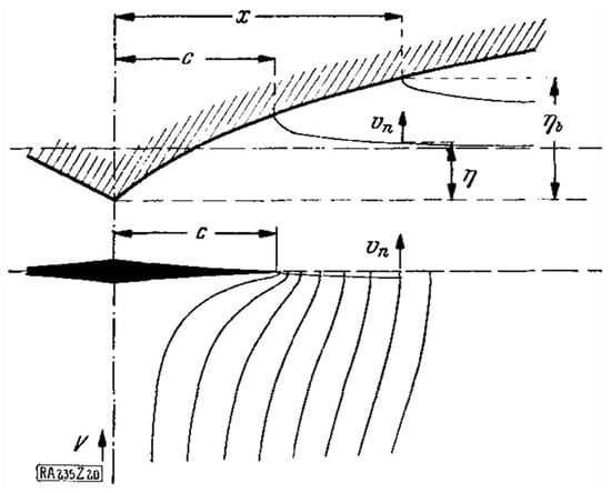 Based on Von Karman’s research, Wagner [10] considered the phenomenon of water surface lifting during the process of the wedge entering water. He introduced the potential flow theory to build the Generalized Wagner Model (GWM). The velocity field constructed by Wagner is shown in Figure 3.