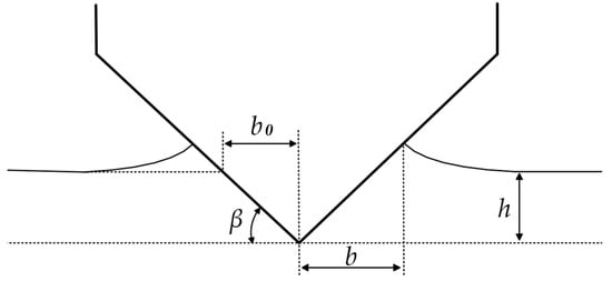 In Figure 4, h is the displacement of the dropped wedge, b is the half-width that is wetted, b0 represents the half-width of the wedge without water rise, and β is the dead-rise angle of the wedge. According to the law of momentum conservation, the momentum of the moving system is