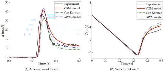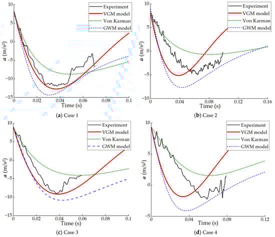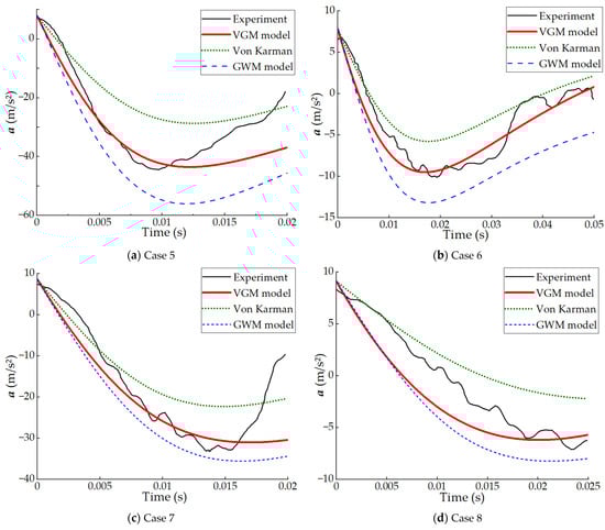 Figure 7 and Figure 8 show comparisons between the accelerations calculated by three theoretical models and the experimental results obtained in Wu’s research. Since the acceleration data provided in Wu’s research are not comprehensive, the comparison for each case can only utilize the data within the corresponding time frame. Additionally, due to the influence of friction in Wu’s experimental setup, the magnitude of the gravitational acceleration provided by Wu in each case is not exactly 9.8 m/s2. This discrepancy contributes to the differences between the theoretical and the experimental results. By observing Cases 2 and 4, it can be found that the acceleration calculated by the VGM model does not entirely align with the experimental results in terms of timing. The VGM model reaches the minimum value earlier than Wu’s experiment. The discrepancy may be attributed to the acceleration measured in the experiment being altered by friction on the experimental support.