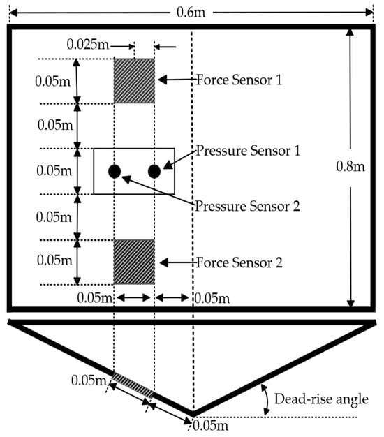 The main dimensions and sensor arrangement of the WILS JIP-III wedge model are shown in Figure 9, and the experimental setup is depicted in Figure 10. Two pressure sensors and two force sensors are positioned on the bottom surface of the wedge. The pressure sensor is located on the bottom surface 0.05 m and 0.1 m away from the longitudinal section in the center plane of the wedge, and the force sensor is situated on the bottom surface at a distance of 0.05 m between the middle transverse section and the longitudinal section in the center plane. The wedge measures 0.8 m in length and 0.6 m in width, weighs 85.375 kg, and the dead-rise angles are designed to be 20° and 30°. The drop height of the wedge was determined to be 0.5 m and 0.25 m. KRISO assumed that the experimental tank would be infinitely long and 1.2 m wide. The water depth is 1.0 m. A water blocking plate ensures the two-dimensional flow of the wedge when it enters the water. The impacting phenomenon of the wedge was recorded by a high-speed camera and accelerometer measurements. More details on the experimental setup are available from Kim et al. [35].