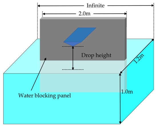 An outline of the simulation model is shown in Figure 5, and the experimental model and facilities are presented in Figure 6. The experiment is carried out using two wedge models with different dead-rise angles β. The two models are both 60 cm long and 20 cm wide, with a plate thickness of 3 mm. Owing to the presence of friction, the acceleration of the model is not equal to the acceleration of gravity. Wu et al. [33] assumed that the model was subjected to the same friction in water as in air, and that the mass, acceleration, and speed of the wedge drop experiments can be adjusted by changing the initial height and adding weight to the model. Eight experimental cases were performed in Wu’s experiments. In this section, all the cases are verified by comparing the theoretical VGM model proposed in this study with the experimental results from Wu’s research. The eight cases and the experimental parameters are given in Table 1.