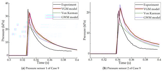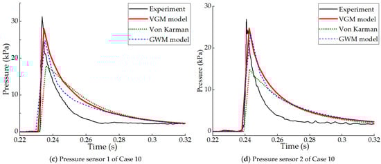 Figure 11 illustrates the pressure histories recorded by pressure sensors No. 1 and No. 2 for Cases 9 and 10, comparing the experimental data with the numerical results obtained from three theoretical models. The positions of sensors No. 1 and No. 2 are 0.05 m and 0.1 m away from the longitudinal plane, respectively. For the pressure histories of the two locations in Cases 9 and 10, it can be observed from the results in Figure 11 that the calculated values of the VGM model are closest to the experimental measurements of WILS JIP-III. The second is the GWM. There is only a small difference between the calculated results of the GWM and the VGM model in the four comparison graphs. Notably, as the influence of water surface change not taken into account, the pressure values calculated using Von Karman’s method are significantly lower than those measured by WILS JIP-III in all four comparison results.