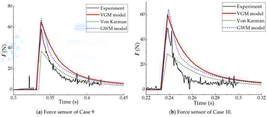 Figure 12 shows the comparisons and verifications between the three theoretical models and the measured values of the force sensor in the WILS JIP-III experiment. It can be observed from Figure 12 that the force values calculated by Von Karman’s method are smaller than those measured experimentally. However, the calculated results of the VGM model and the GWM are slightly larger than the experimental measurements of WILS JIP-III. Moreover, the value of the VGM model is closer to the experimental result than the GWM. In both cases of comparing force histories, the VGM model demonstrates good agreement with the WILS JIP-III experiment, and the numerical values obtained by the VGM model are slightly higher than those from the WILS JIP-III experiment results. It indicates that the VGM model can be effectively applied in practical engineering for measuring force histories.