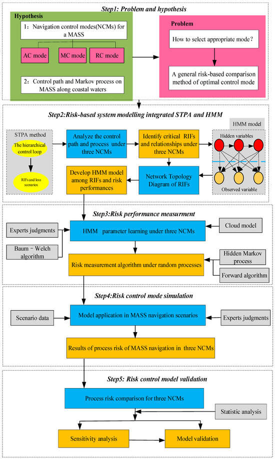 The structure of this paper is as follows: Section 2 introduces the proposed framework, which includes risk-based system modeling, a risk measurement algorithm, and simulation steps. In Section 3, we present the application of STPA-HMMs in scenarios involving coastal open waters, along with the results of risk evolution for the MASS navigation process under three NCMs and verification of model sensitivity. The findings are discussed in Section 4, followed by a summary of study conclusions in Section 5.