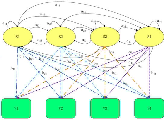 The upper layer of the model displayed four types of risk performances,  represented a set of risk states, which were not visible and cannot be measured directly, and  was a state sequence with a length of T. The lower layer of the model was an observable set of RIFs. Considering that directly applying all influencing factors to the model can lead to excessively verbose observation samples, here,  was defined as the state space of observation variables to simplify calculation, and  was an observation sequence at any time, M represented the number of RIFs.