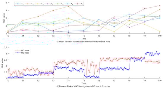 MASS constitutes an elaborate human–machine intelligent system, and the evolution of navigation constitutes a complex and dynamic progress. Given that MASS is still in its initial stage of development, the hierarchical control structure formulated in this study merely depicts a simplistic initial framework, which will be consecutively enhanced in future research undertakings. This subsequently brings about two notable limitations in this study. Firstly, the risk factors are analyzed based on the developed hierarchical control structure, and a simplified hierarchical control structure is unfavorable for obtaining a comprehensive understanding of risk factors, potentially influencing the evaluation outcomes. Secondly, accurately obtaining transfer variables based on the security information exchange process currently poses a significant challenge. In this study, the parameter training set is derived from expert prior knowledge to acquire transfer variables in the HMM. Due to the differences among expert knowledge levels and limitations in comprehension, model parameters are inevitably prone to certain subjectivity. Nevertheless, this does not undermine the overall concept of the risk assessment framework proposed in this article, which supplements the ongoing research work concentrating on MASS navigation risk and safety. With the extensive operation of MASS in the future, integrating expert knowledge with objective data in subsequent research can effectively address this issue by continuously amending the evaluation indicators and model parameters.