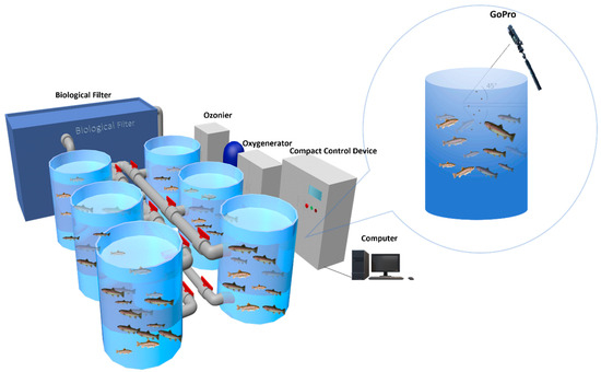 The experiment used rainbow trout procured from the Shuntong Breeding Base in Huairou District, Beijing, China. Each fish had an average weight of 500 ± 10 g, with a total of 120 individuals. As fish are sensitive organisms and can react strongly to changes in their environment, all fish were acclimatized to the experimental conditions for one and a half months upon arrival to minimize the impact of stress reactions on the experimental results. This experiment was conducted at the Aquatic Precision Aquaculture Laboratory of the Information Technology Research Center, Beijing Academy of Agriculture and Forestry Sciences. The experimental environment consisted of a recirculating aquaculture system (RAS), as shown in Figure 1, comprising a total of 6 fish tanks (each tank has a diameter of approximately 1 m and a depth of 1.2 m), with 20 fish placed in each tank. The dissolved oxygen concentration in the water was maintained at 9–12 mg/L, and the water temperature was 16 ± 0.5 °C. Following the commencement of the experiment, manual feeding of fish in each tank occurred daily at 9 a.m. and 6 p.m. The feed provided to the fish contained essential nutrients: a minimum of 52% crude protein, at least 11% crude fat, a maximum of 5% crude fiber, and up to 13% crude ash (Hanye Biotechnology Co., Ltd., Rizhao, China). The feeding amount was generally around 1.6% of the fish’s body weight. Video data collection was conducted using a GoPro Hero8 (14 mm focal length). To mitigate the effects of surface reflections during data acquisition, the camera angle was set at a 45-degree angle relative to the water surface (Figure 1).