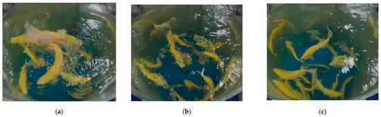In this experiment, the feeding intensity of rainbow trout is classified into 3 categories: strong, moderate, and weak (Figure 2), as shown in Table 1. Previous studies classified fish feeding intensity into four levels: strong, moderate, weak, and none [9,47]. Considering the practical scenario in aquaculture where machine vision devices halt feeding when detecting weak feeding intensity, the “none” feeding intensity was not included in this experiment. The dataset processing procedure is outlined as follows: The fish feeding videos start recording 10 s before feeding begins and stop 10 s after the fish finish feeding and become calm. This ensures that the entire feeding cycle of the fish is captured. The video clips were captured at a frame rate of 60 Hz and a resolution of 1920 × 1080 pixels. The data collection spanned over 2 months, resulting in a total of 120 video segments, each lasting 28–32 s (Table 2). To reduce data similarity, 3600 images were extracted by sampling 2 frames per second from the videos. From these, 2685 images were selected, with 1710 images used as the training and validation sets and the remaining 975 images used as the test set (Table 3). The detailed breakdown of data obtained for each category is shown in Table 1. The images were manually annotated and classified into three levels of feeding intensity: strong, moderate, and weak. The ground truth of the images was established by the experimental team members over a period of two weeks. The classification was based on prior classifications and the team’s expertise [9]. The accuracy of the classification was ensured through thorough cross-verification and consensus among the team members. The images used for training and validation underwent data augmentation techniques such as flipping, translation, and noise addition, resulting in a final dataset of 6919 images, with 5536 images allocated for training and 1383 images allocated for validation. The classification and sample numbers of the dataset are shown in Table 3.