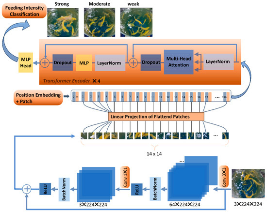 Currently, in research on quantifying fish feeding classification, models primarily utilize a CNN as the backbone network. However, traditional CNNs extract features layer by layer through a local receptive field, which limits their ability to capture global information in the initial layers. A broader understanding of the global context usually requires deeper network architectures or specially designed modules. In deep networks, gradients may become very small (vanish) or very large (explode) during the backpropagation process, making the network difficult to train. Vanishing gradients can lead to slow learning or complete stagnation in the training process, while exploding gradients may cause numerical issues during training. As the depth of the network increases, adjusting parameters becomes more challenging, leading to instability and suboptimal training outcomes. Even with advanced optimization algorithms, without additional aids such as residual connections [44], deep networks are difficult to converge. The residual network (ResNet), proposed by Kaiming He [44], is a deep neural network architecture aimed at addressing the issues of vanishing and exploding gradients during the training of deep networks. In recent years, the Vision Transformer has drawn inspiration from the successful application of the Transformer model in the field of natural language processing (NLP) [45]. In NLP, the Transformer model is widely used to process sequence data, such as text sequences [46]. ViT adopts the self-attention mechanism of the Transformer to handle image data. It divides the image into individual image patches and then converts these image patches into sequential data, which are input into the Transformer model for processing. By modeling the relationships between image patches, the ViT model captures global information, enabling it to consider the overall structure and context of the image, not just local features. However, ViT requires substantial computational resources from hardware and needs a large amount of data for training. The multilayer stacking of the transformer encoder within its internal structure accounts for most of the model’s computational demands. Reducing the number of these stacks can significantly decrease the computational requirements of the model.