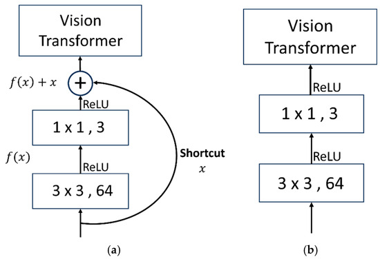 Before processing the image into patches, a residual module was introduced for feature extraction. The residual network (ResNet) is a deep neural network architecture that introduces skip connections between layers to address the problems of vanishing and exploding gradients during training. It was proposed by researchers at Microsoft Research Asia and has achieved great success in the ImageNet large-scale image recognition field. The ResNet module typically consists of several residual blocks. Each residual block contains two branches: a main branch and a skip connection (shortcut) branch (Figure 4a). The main branch typically consists of a series of convolutional layers and activation functions, while the skip connection branch directly passes the input signal to the output, allowing the network to learn residuals rather than directly learning feature mappings. The computational formula is represented as follows, as shown in Equation (1). Among them, denotes the result obtained by processing the input data through convolutional layers and activation functions ReLU [48], and represents the original input data. The addition of the two yields the final output . This design effectively alleviates the problem of gradient vanishing, enabling the network to be trained deeper and more easily. In addition to using the residual structure, it was also compared with regular convolutional modules (plain convolution network), as shown in Figure 4b.