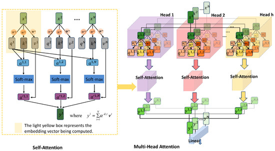 The Multi-Head Attention (MHA) mechanism is derived from the Self-Attention structure, and the two mechanisms are shown in Figure 5. Self-Attention allows each element in the input sequence to interact with all other elements in the sequence. In Equation (5), Q, K and V represent sets of q, k, and v, respectively, where Q stands for query, K stands for key, and V represents the information extracted from . For each image sequence input data (, , … ) with a length of N, N is 197. After input embedding, each sequence x is flattened into a one-dimensional vector of size (768). Subsequently, these 197 sequences are individually multiplied by three weight matrices , , and (which are trainable and shared) to obtain corresponding , , and (). Then, each in the sequence is multiplied by each transposed in the sequence and divided by a scaling factor , where represents the length of each sequence, which is 768 in this case. The results obtained from the above operation are then processed through softmax activation and finally weighted and cumulatively summed with each in the sequence, according to Equation (6). Multi-Head Attention operates by running multiple Self-Attention layers in parallel and synthesizing their results. After the sequence embedding data are input, each sequence is divided into parts, that is, for heads, the number of in each base model is 12, while in each large model, there are 16 heads. Each ‘head’ independently learns different attention weights as in Equation (7), where . Then, the outputs of these self-attention layers (12) for each sequence are combined, concatenated (Equation (8), ) and then passed through a linear layer, which is further processed in the subsequent neural network layer. In this way, Multi-Head Attention enables the model to capture information from different subspaces of the input sequence simultaneously, thereby enhancing the model’s expressive power.