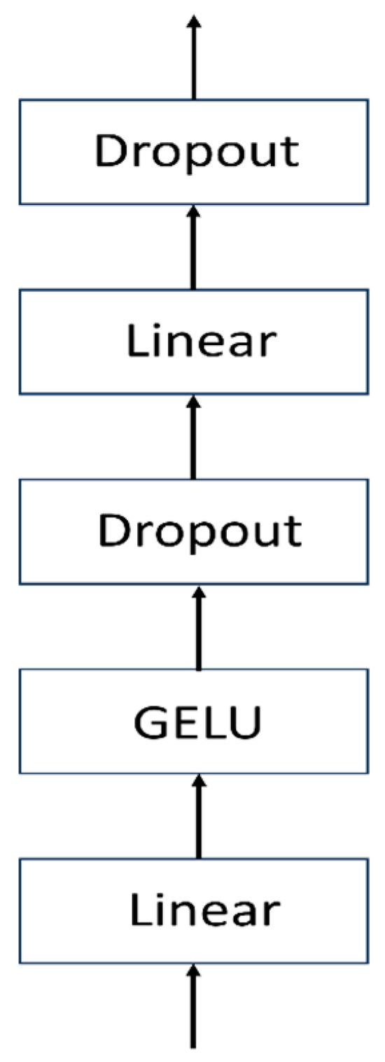 The MLP Block consists of two linear fully connected layers, one GELU activation layer, and two Dropout layers (Figure 6). The first linear layer increases the dimensionality, followed by a GELU activation and then a Dropout layer to regularize the data. Next, the data pass through another linear layer, which restores the dimensionality to that before the first linear layer. Finally, it passes through another Dropout layer before outputting.