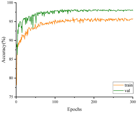 The accuracy results on the training set and the validation set for the CFFI-Vit are presented in Figure 8. The graph shows that the accuracy on the validation set remains higher than that on the training set after approximately 10 epochs, indicating that the accuracy of fish feeding intensity classification is better on the validation set than on the training set. The initial classification accuracy on the training set is 78.2%, and both the training and validation accuracies exhibit fluctuating upward trends during the first 100 epochs. After 100 epochs, the accuracies of both the training set and validation set gradually stabilize. Training set accuracy converges around 95.79%, while validation set accuracy converges at 98.63%.