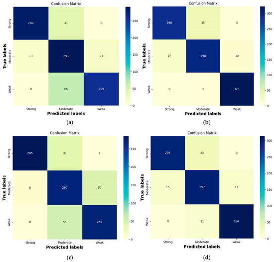 Confusion matrices of the proposed models on the test set. (a) ViT-B/16+Res. (b) ViT-B/16+Res_21K. (c) ViT-L/16+Res. (d) ViT-L/16+Res_21K.