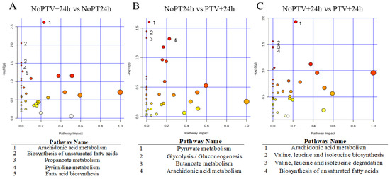 Five enriched metabolic pathways were identified (arachidonic acid metabolism, unsaturated fatty acid biosynthesis, propanoate metabolism, pyrimidine metabolism, and fatty acid biosynthesis) when comparing non-pretreated/infected larvae (NoPTV+24h) with non-pretreated/non-infected larvae (NoPT24h) (Figure 2A). When comparing non-the pretreated/non-infected larvae (NoPT24h) with the pretreated/infected larvae (PTV+24h), four enriched metabolic pathways were identified (pyruvate metabolism, glycolysis and gluconeogenesis, butanoate metabolism, and arachidonic acid metabolism) (Figure 2B).