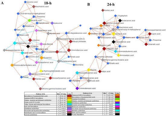 Among all the classified metabolites, the majority were found to relate to the unsaturated fatty acid biosynthesis (seven hits) and aminoacyl-transfer ribonucleic acid (tRNA) biosynthesis (seven hits) pathways at both 18 h and 24 h (Figure 3). At 18 h, metabolites associated with fatty acid biosynthesis exhibit a central connection, with some metabolites co-regulated and others inverse-regulated from the center of the network (Figure 3A).