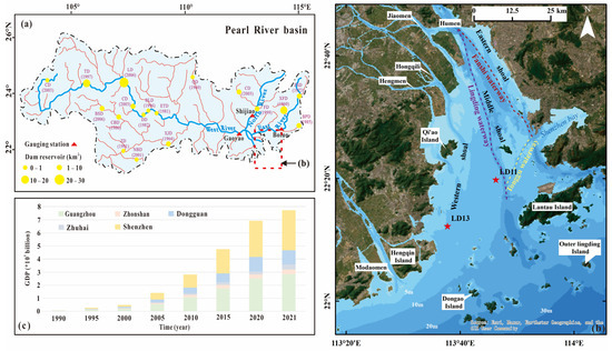 (a) A map of the Pearl River basin. (b) Location map of four outlets (Humen, Jiaomen, Hongqili, and Hengmen), three shoals (west shoals, middle shoals, and east shoals), main shipping lane (Lingding waterway, Fanshi waterway, and Tonggu waterway), and sampling sites (LD11 and LD13). (c) Gross domestic product of the LE coastal cities (data are available at www.dsec.gov.mo (accessed on 1 May 2024) and stats.gd.gov.cn (accessed on 1 May 2024)).