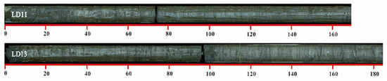 Photographs of cores LD11 and LD13 (units: cm). Core LD11 measures 167 cm in length, while LD13 measures 185 cm.