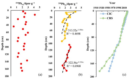 (a) Vertical distribution of 210Pbex in core LD11 (Red dots is excess 210Pb radioactivity). (b) Vertical distribution of 210Pbex and exponential fitting between depth (Y axis: cm) and 210Pbex (X axis: dpm·g−1) in core LD13 (Yellow dots is excess 210Pb radioactivity in the upper section; Red dots is excess 210Pb radioactivity in the lower section; Black dashed lines is the fitting curve). (c) The depth–age framework of LD13 based on CIC and CRS model.