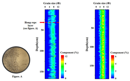 LD11 has a relatively single lithology, mainly composed of dark gray and grayish-green clayey silt, with thin sandy layers. Plant roots, shell fragments, and artificial debris (such as hemp rope) can be seen (Figure 4). The component percentage of silt fluctuates greatly, ranging from 0 to 75.34%, with an average value of 60.40%. The sand content is the lowest, ranging from 0 to 50.70%, with an average value of 7.97%. The clay content is in between, with a wide range of variation, with a maximum value of 100%, a minimum value of 13.13%, and an average value of 31.63%. The average grain size ranges from 4.70 to 9.03 Φ, and an average value is 5.87 Φ. The fluctuation range of the sorting coefficient is 0.53~2.46, with an average value of 1.72, indicating good to poor sorting. Among them, samples with poor sorting performance are dominant. The skewness fluctuation range is −0.29~0.50, with an average value of −0.07. The kurtosis value ranges from 0.68 to 1.15, with an average value of 0.93.