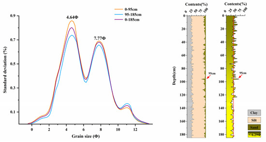 Sensitive grain size curves, variations in content of grain size, and <6.29 Φ components of core LD13 are as follows: There are two peak values of standard deviation at 4.64 Φ and 7.77 Φ, respectively; 6.29 Φ is the separation point between two sensitive grain sizes. The 95 cm layer shows significant changes in particle size distribution. The content of the <6.29 Φ component decreases from the top to the bottom of the core (the red line represents the average contents of the <6.29 Φ component).