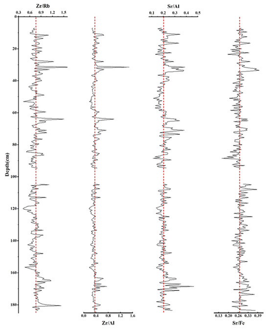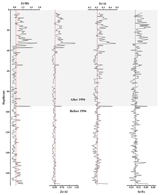 - As the frequency and intensity of influence by multiple anthropogenic stresses have increased, the vertical variation amplitudes of Zr/Rb, Zr/Al, Sr/Al, and Sr/Fe have increased, with standard deviations rising from 0.12, 0.05, 0.31, and 0.30 to 0.23, 0.19, 0.58, and 0.46, respectively. This change response is consistent with the change in grain size and sedimentation rate.