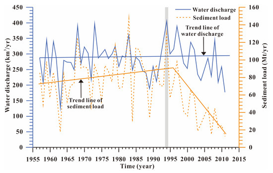 The watershed and estuary are an integrated system, and changes in the runoff and sediment load from the basin due to human activities result in morphological changes in deltas [24,28]. Figure 6 presents the annual water discharge and sediment load of the Pearl River basin since the 1950s as measured at the stations of Gaoyao (West River gauging station), Shijiao (North River gauging station), and Boluo (East River gauging station), averaging ~3.10 × 1011 m3/y and 2.80 × 107 t/y, respectively. Notably, sediment discharge of the Pearl River to the estuary began to show a dramatically decreasing trend after 1994 (Figure 8). The sharp increase in water and sediment discharge in 1994 occurred due to the huge floods in June of 1994 (designated as “94.6”). Before 1994, the water flux and sediment inputs fluctuated but remained relatively constant, except for occasional unusually dry or wet years. Moreover, the fluctuations in sediment load in the river basin were synchronous with fluctuations in water discharge, and both are mainly determined by hydroclimatic factors. This is confirmed by previous studies [17], where the correlation coefficients between water discharge and sediment load were up to 88% [17]. After 1994, conversely, the discharge of water and sediment showed a decreasing trend because much of the river’s sediment load was trapped by the reservoirs [42,43]. Many reservoirs were constructed along the Pearl River for flood control and power generation from the 1950s to the 1990s, with a total storage capacity of 518 × 108 m3, accounting for 15.9% of the annual runoff of the Pearl River [44], particularly after completion of the Longtan reservoir in 2006, the second largest dam in China, with a total storage capacity of 162 × 108 m3 [45]. Compared with the 1950s~1980s, the sediment flux of the Pearl River decreased by 70% after 2006 [17].