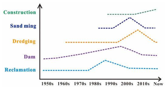 Strongly anthropogenic activities in the basin have resulted in dramatic changes in the estuarine sediment fluxes and dynamical properties, which have led to heterogeneous dynamical–sedimentary–geomorphic processes in the estuary [7], and the state of the estuarine system is also changing [8]. Many major estuaries in the world, such as the Mississippi River [9,10], Mekong River [11], Yellow River [12], and Yangtze River [13,14], have experienced a sharp decrease in sediment load into the sea because of damming, land reclamation, dredging, and sand mining, resulting in complex sedimentary dynamic backgrounds and drastic changes in estuarine topography, sedimentary processes, and mode transitions [7]. With the deepening influence of anthropogenic factors, changes in the estuarine coastal environments have become more significant and rapid. Especially, in specific periods and regions, anthropogenic factors have surpassed natural effects and have become the dominant factors affecting the sedimentation dynamics, sedimentation rate, and sedimentation process in estuaries.
